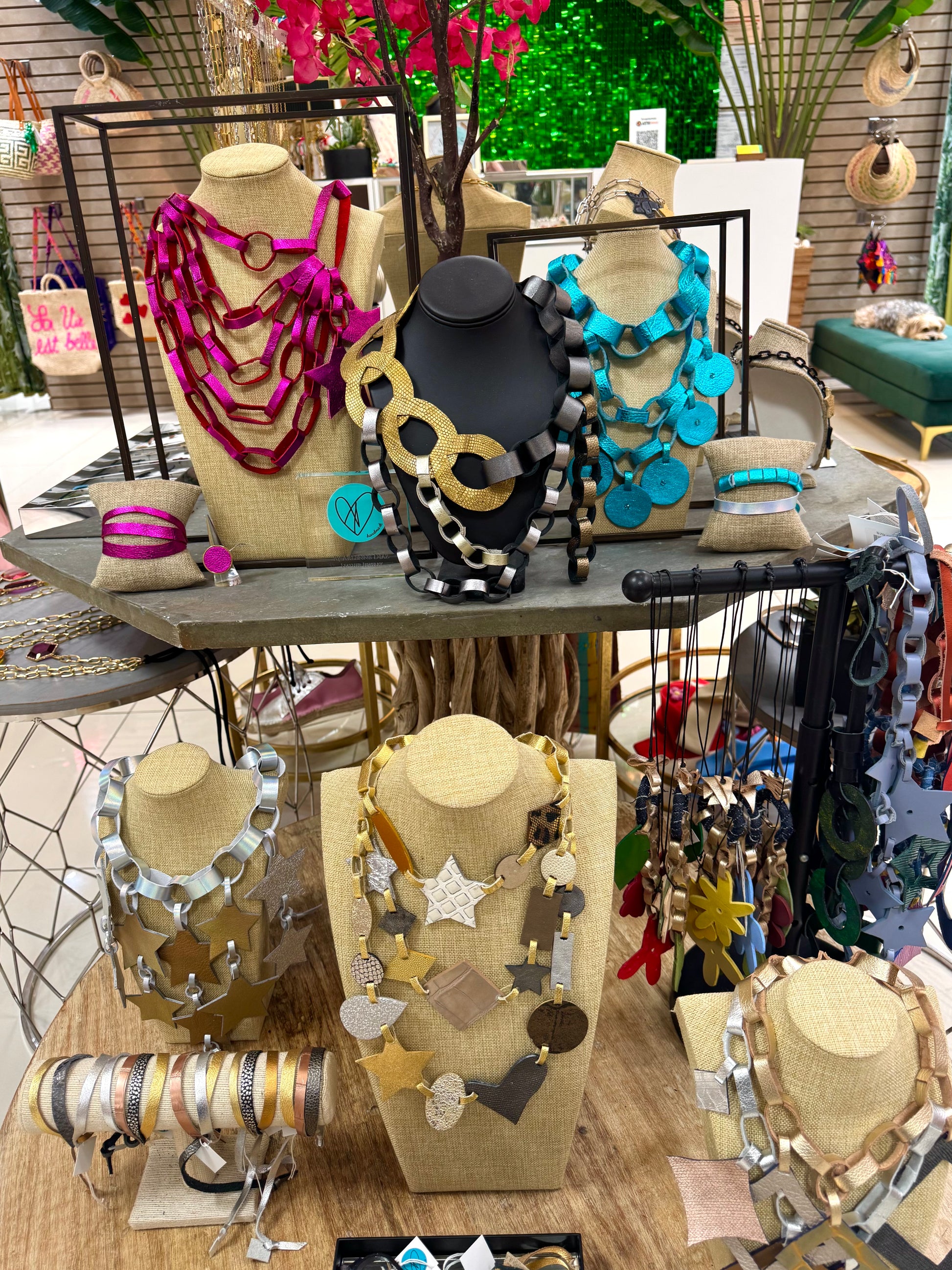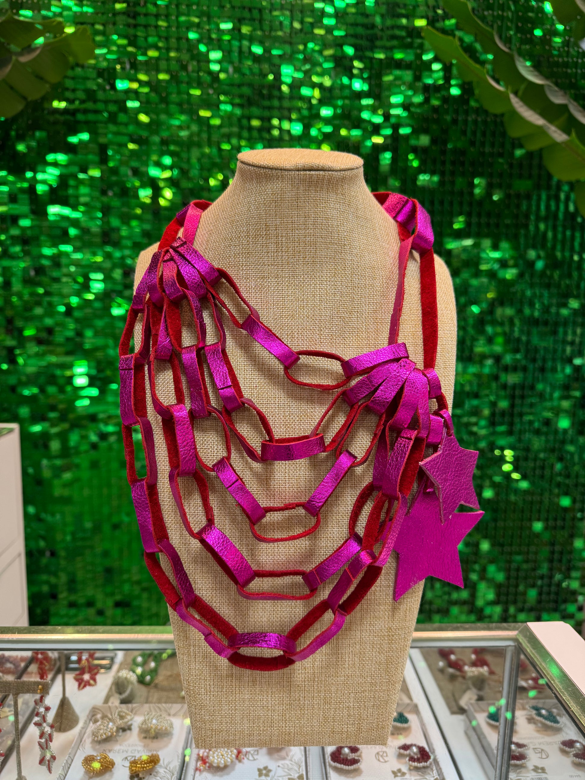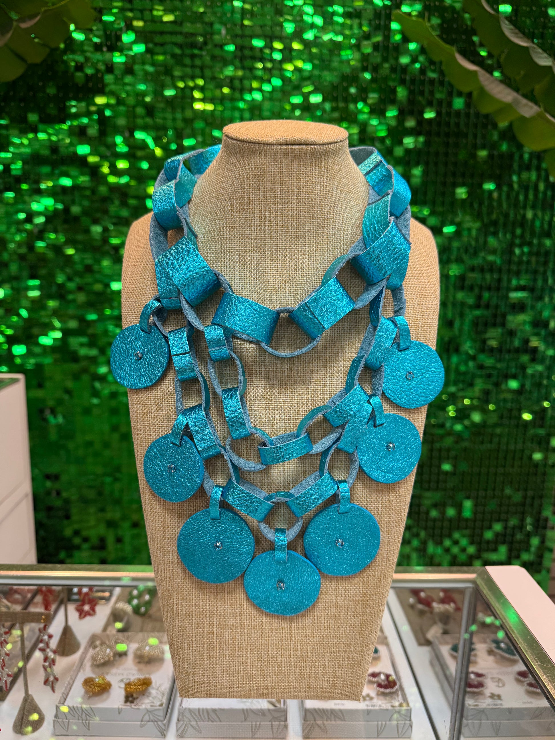 This one-of-a-kind necklace from the Arlenne Diaz Leather Collection is a true statement piece. Handmade with Puerto Rican leather, it adds a touch of unique style to any outfit. Show off your playful side with this quirky accessory!