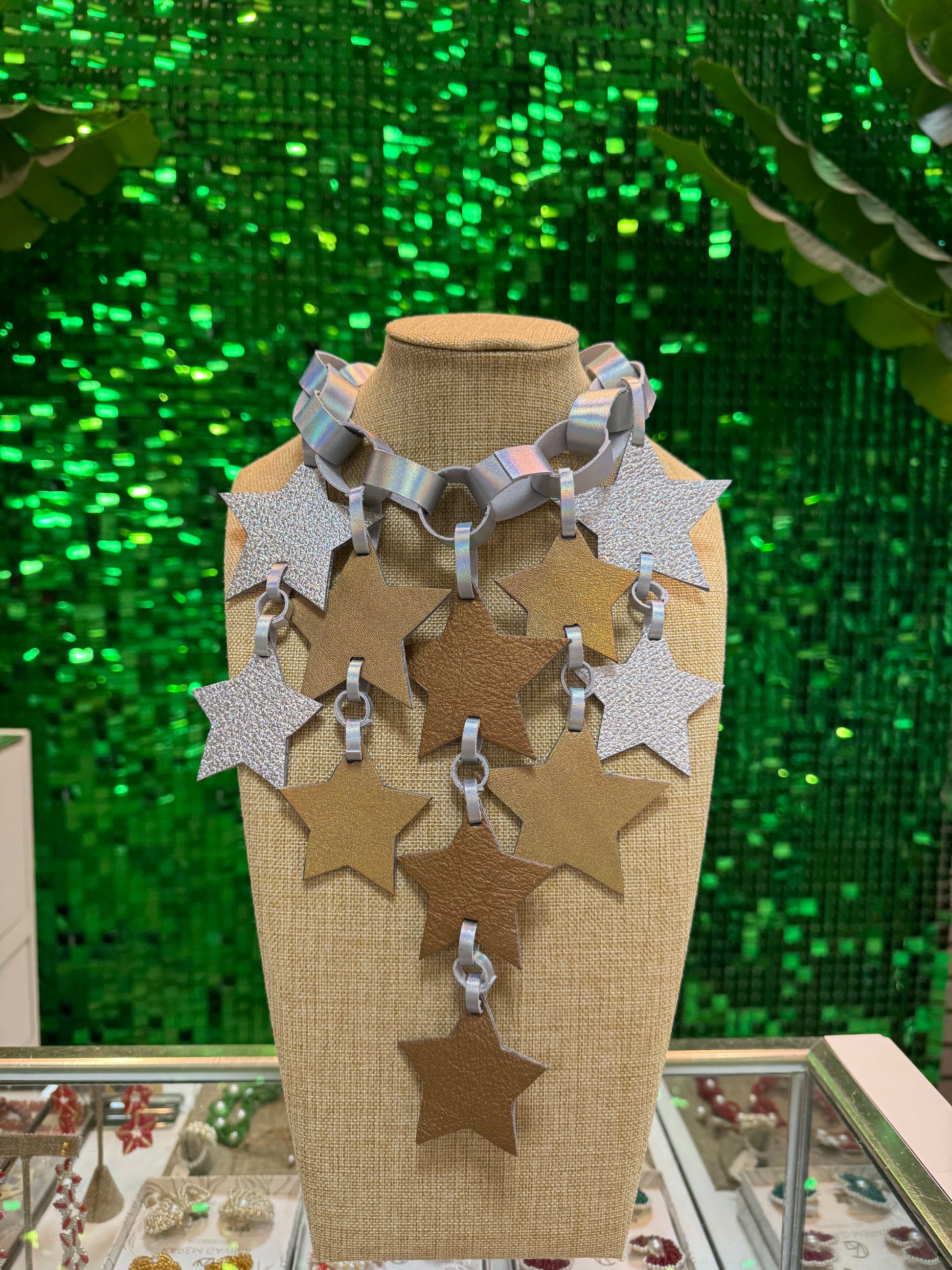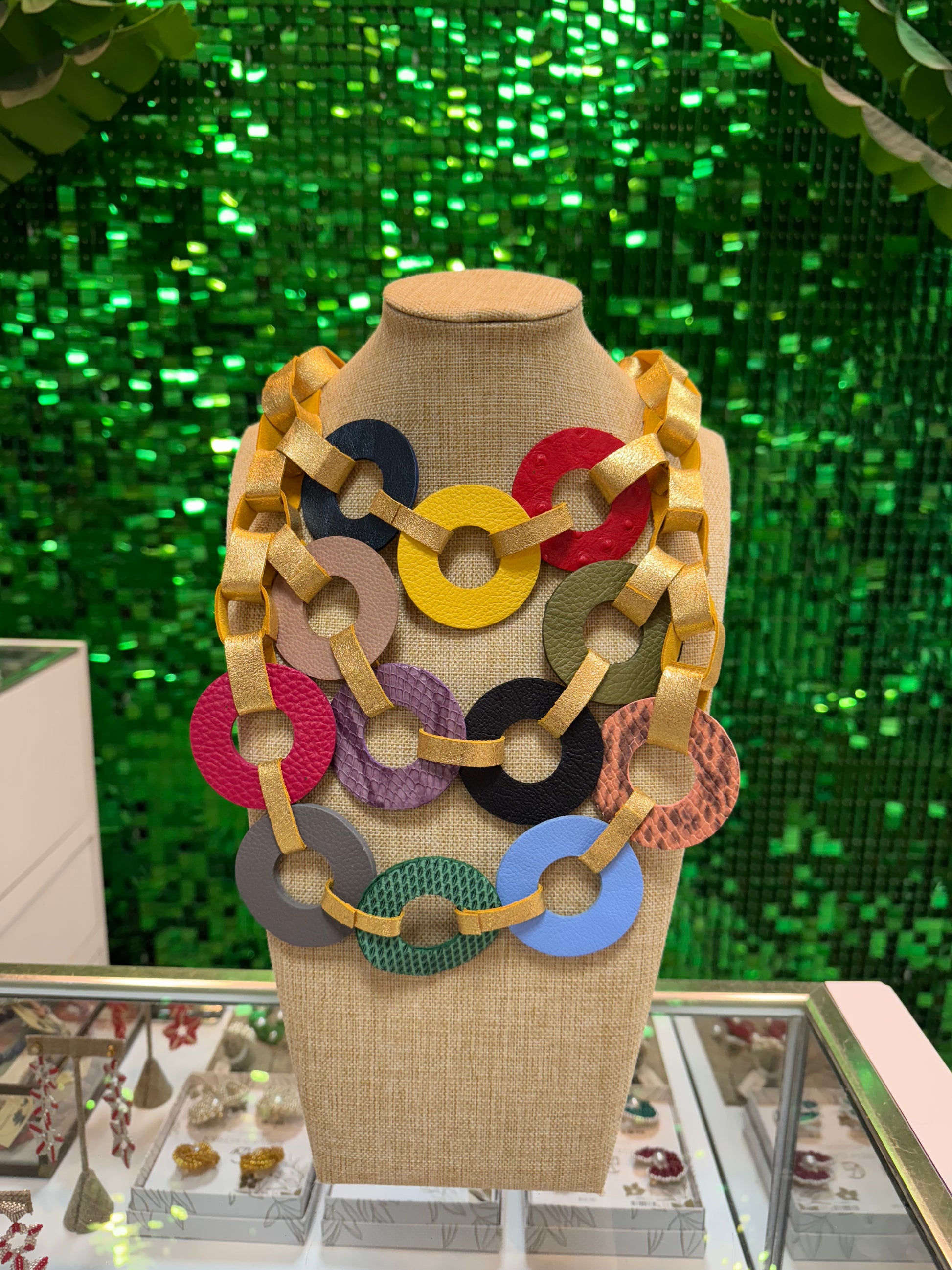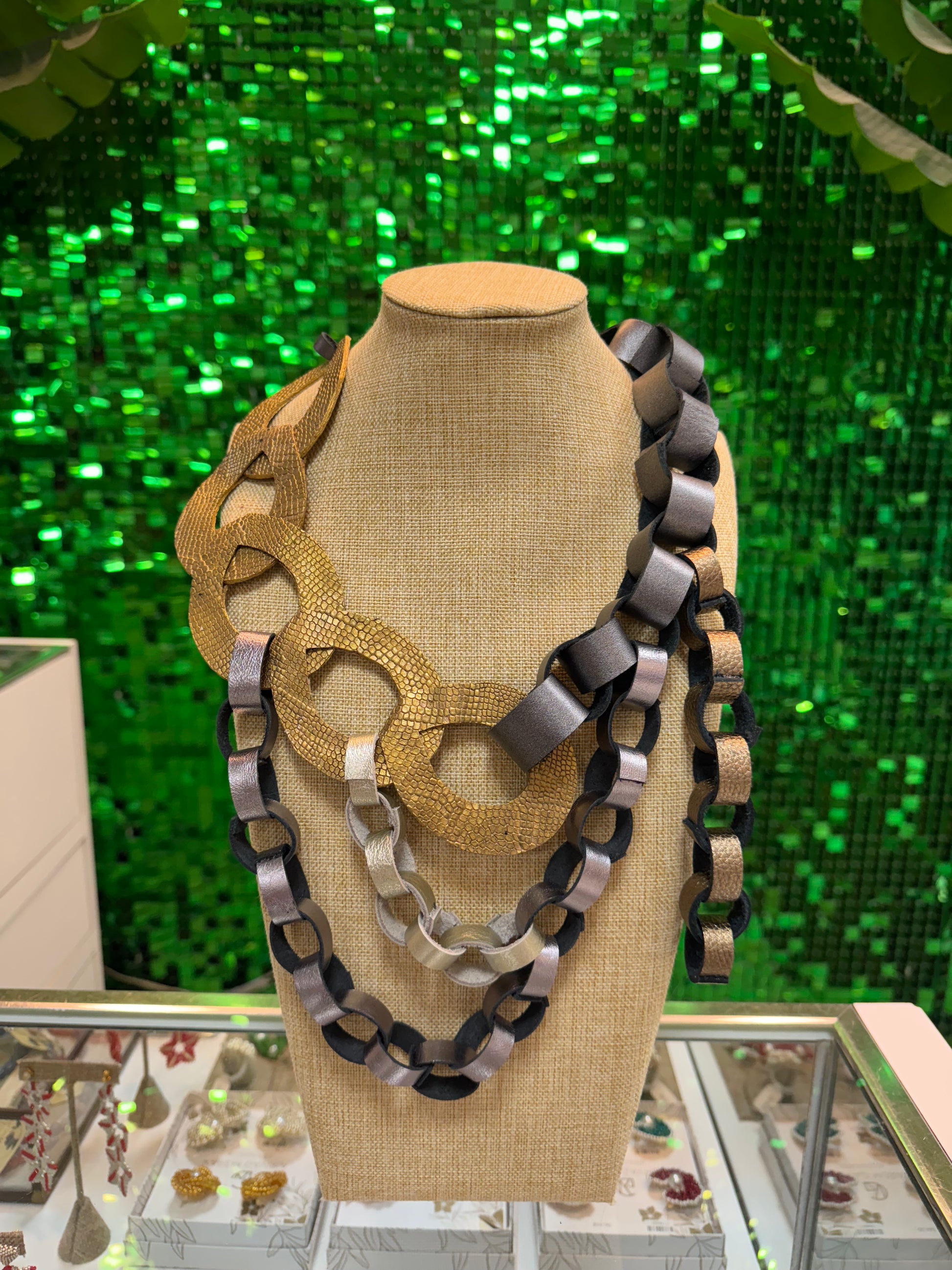 This one-of-a-kind necklace from the Arlenne Diaz Leather Collection is a true statement piece. Handmade with Puerto Rican leather, it adds a touch of unique style to any outfit. Show off your playful side with this quirky accessory!