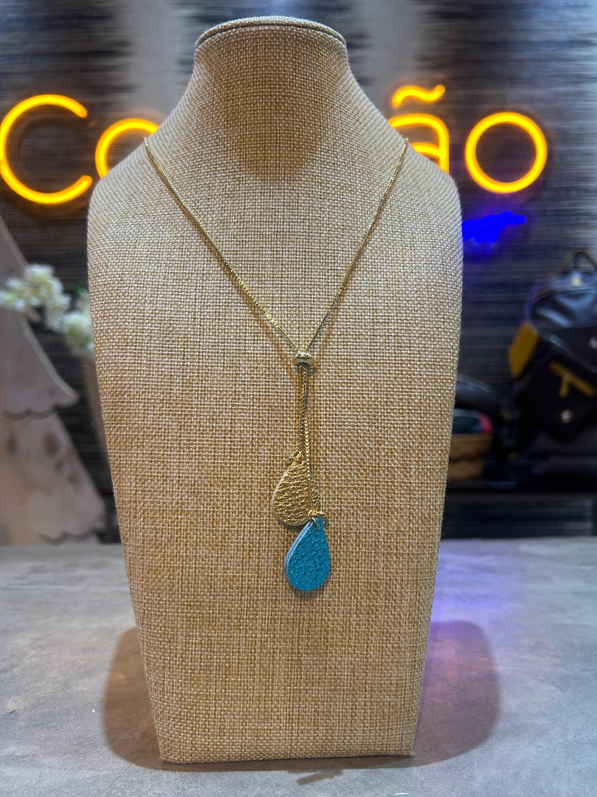 This unique necklace is made from recycled materials and hand-cut by a Puerto Rican designer. Its detailed leather collar adds a touch of sophistication and eco-friendliness to any outfit.