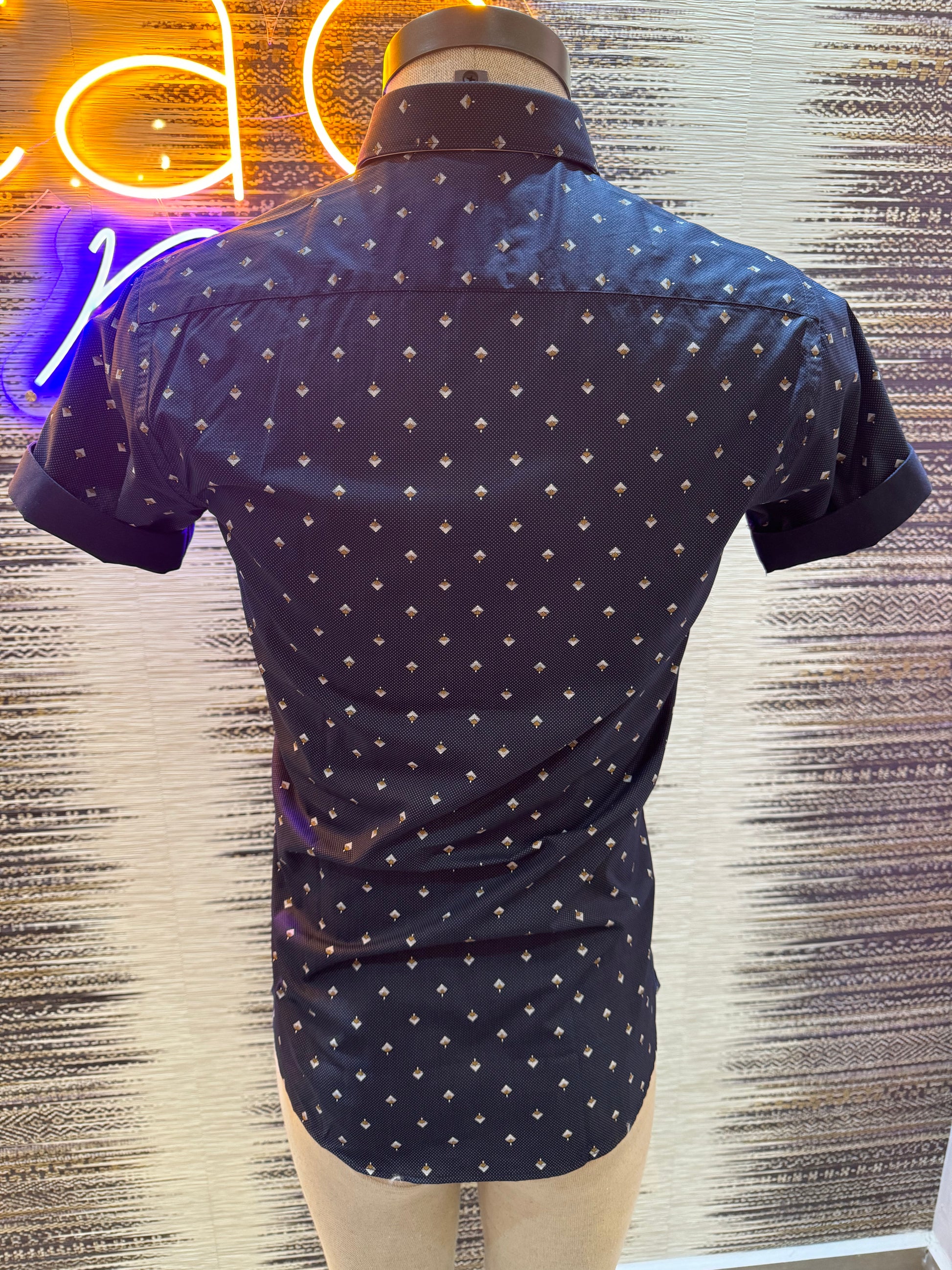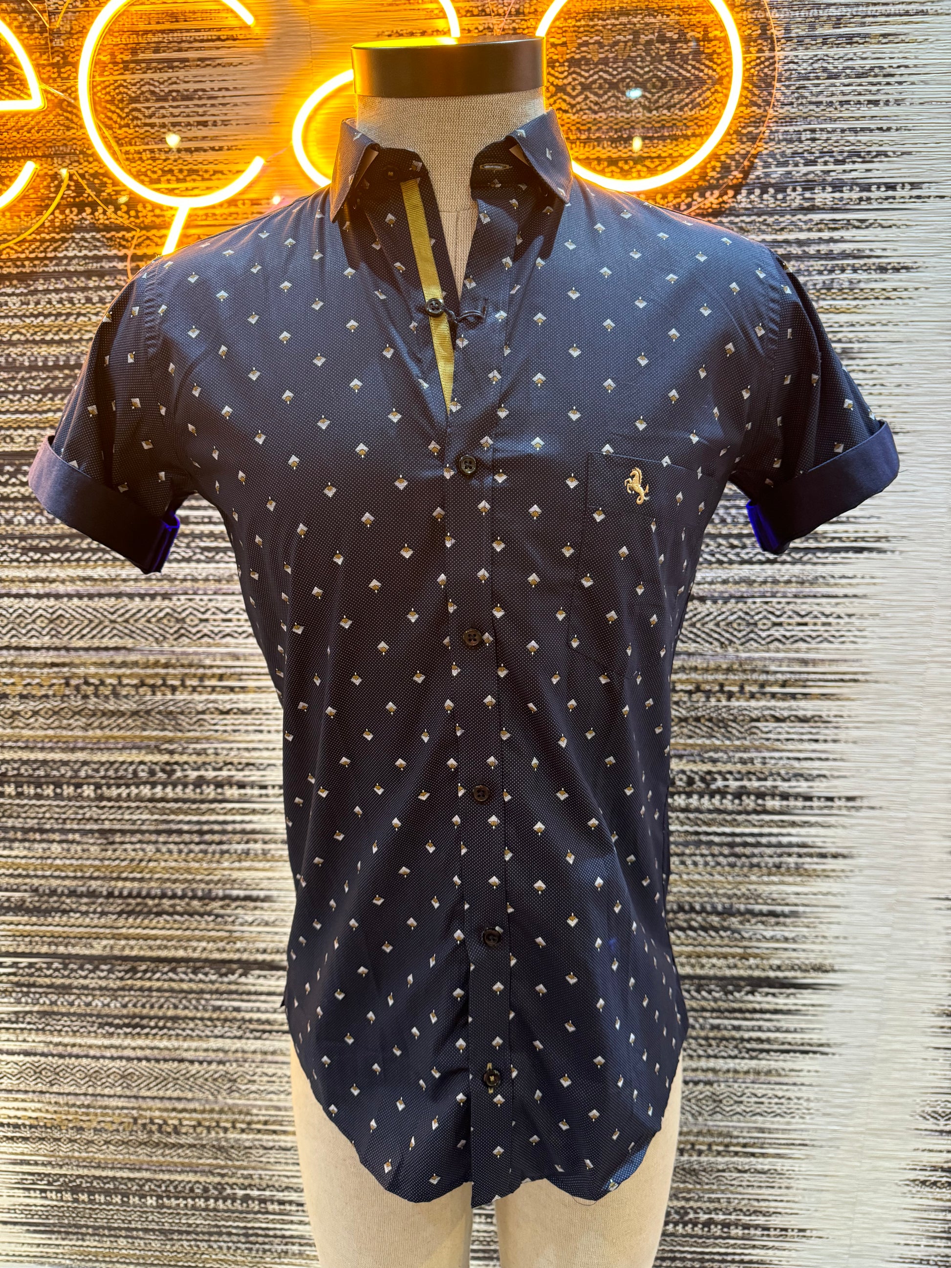Navy and Gold Print Short Sleeves Shirt