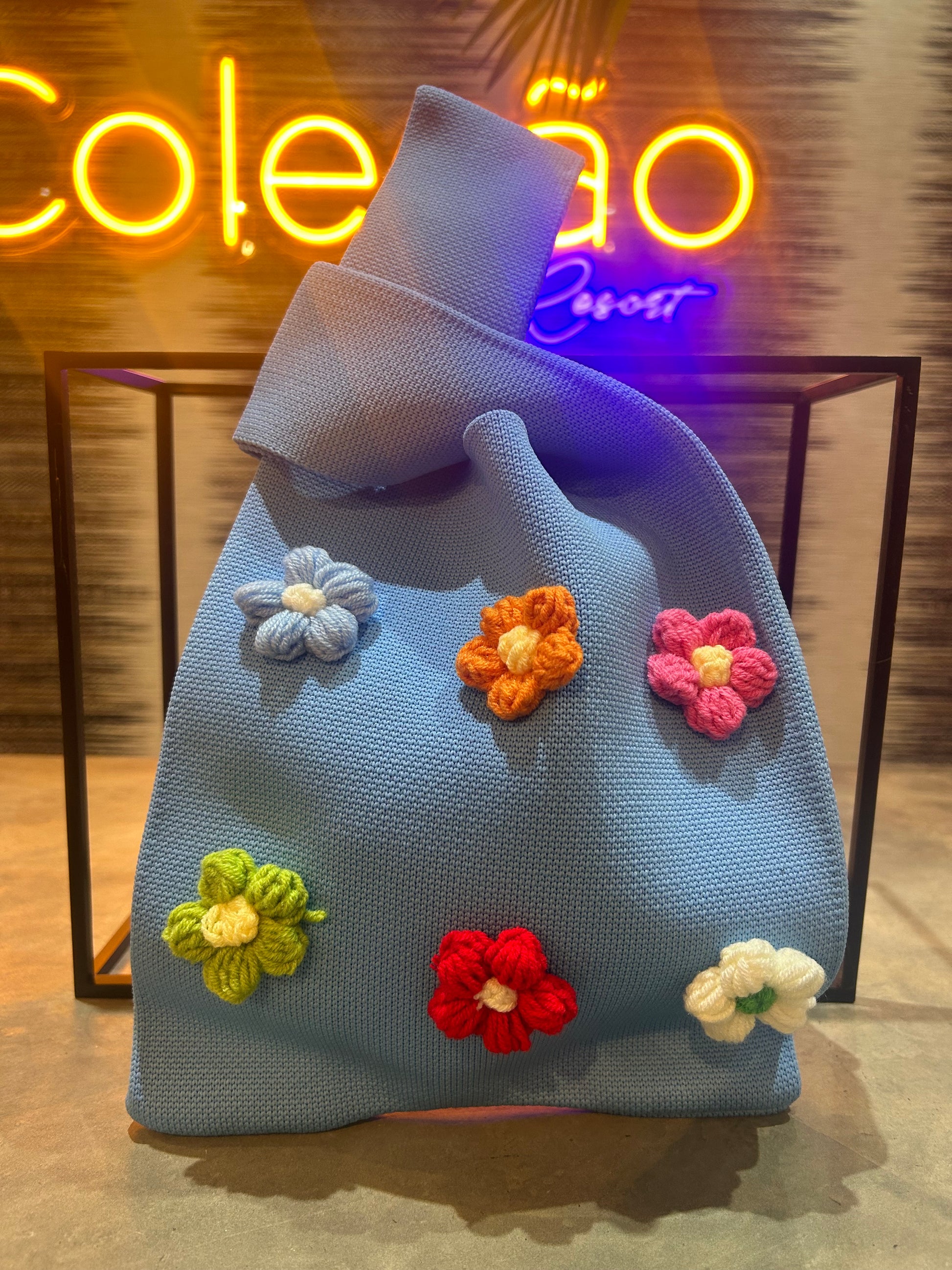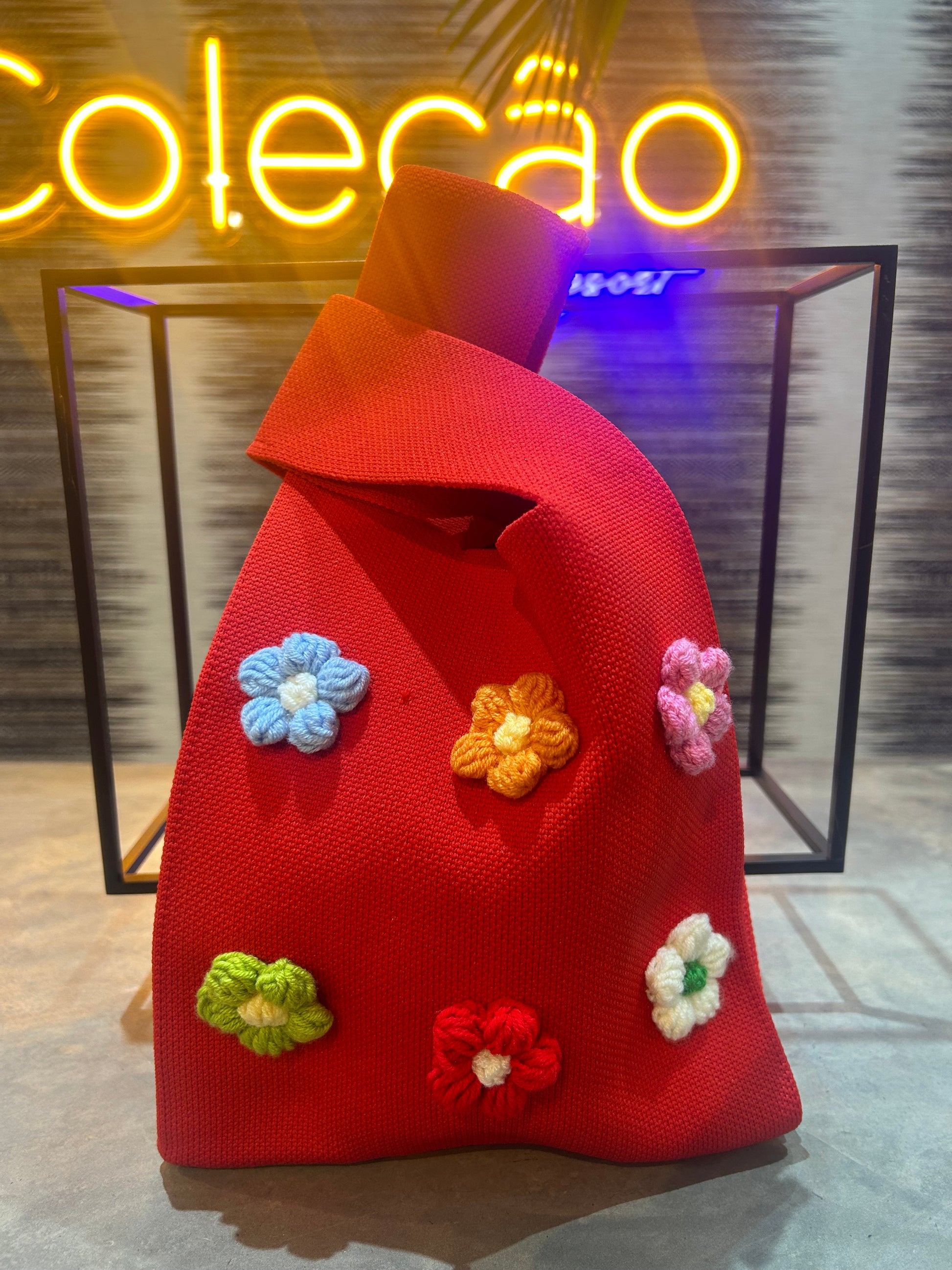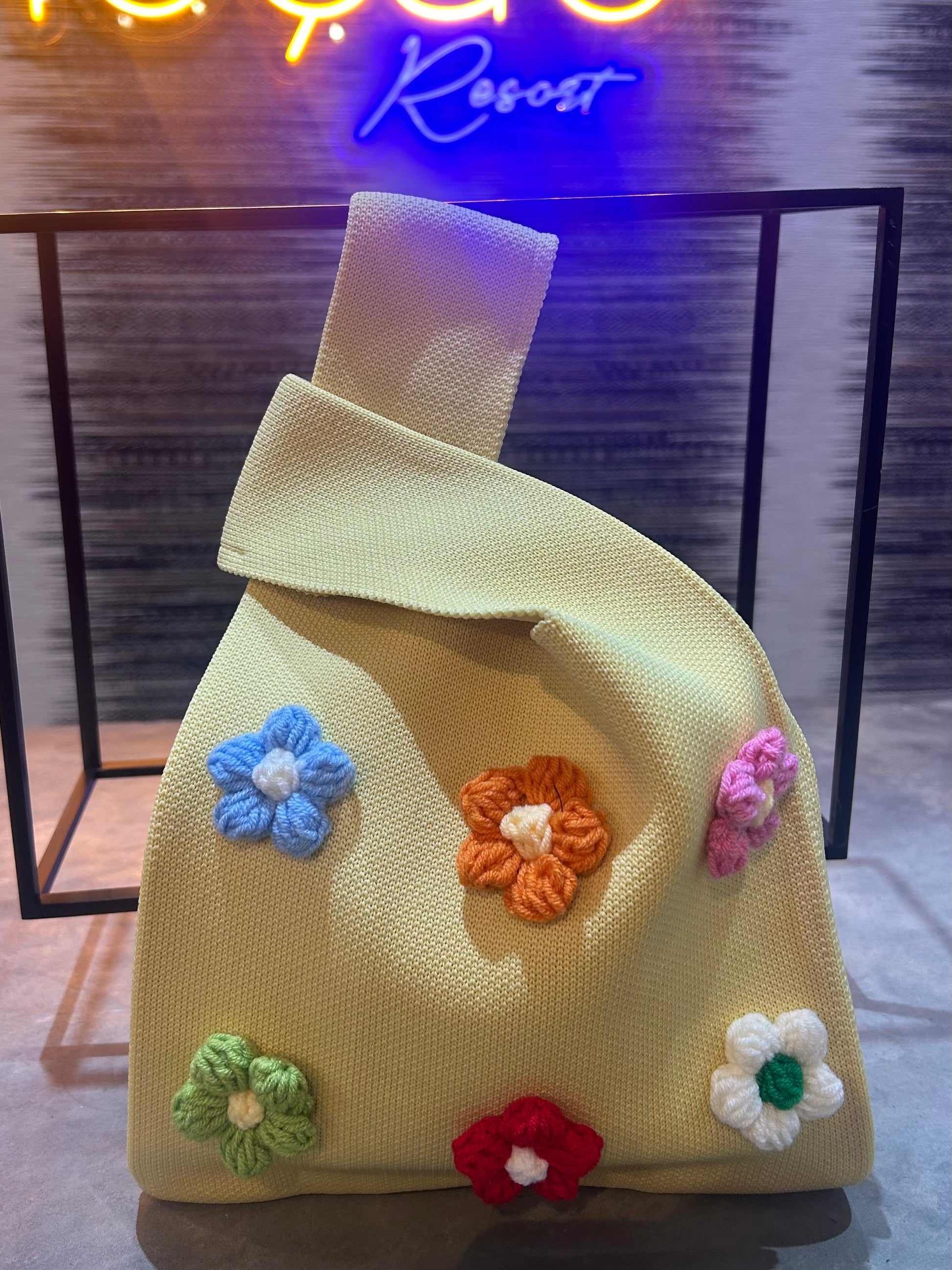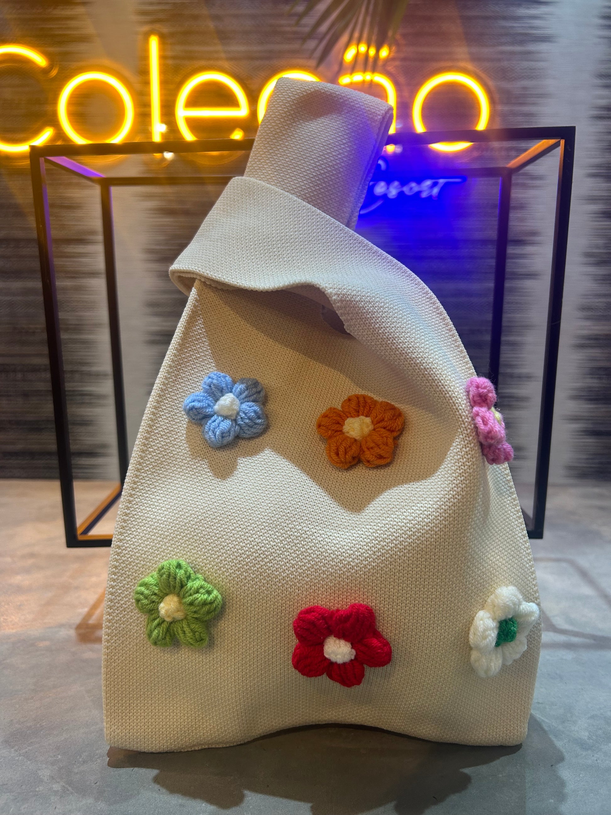 "Carry your essentials in style with the playful Cotton Flower Bag. Made with soft cotton, this bag is both functional and fashionable. Perfect for everyday use or a fun day out with friends. Don't miss out on this quirky accessory!"