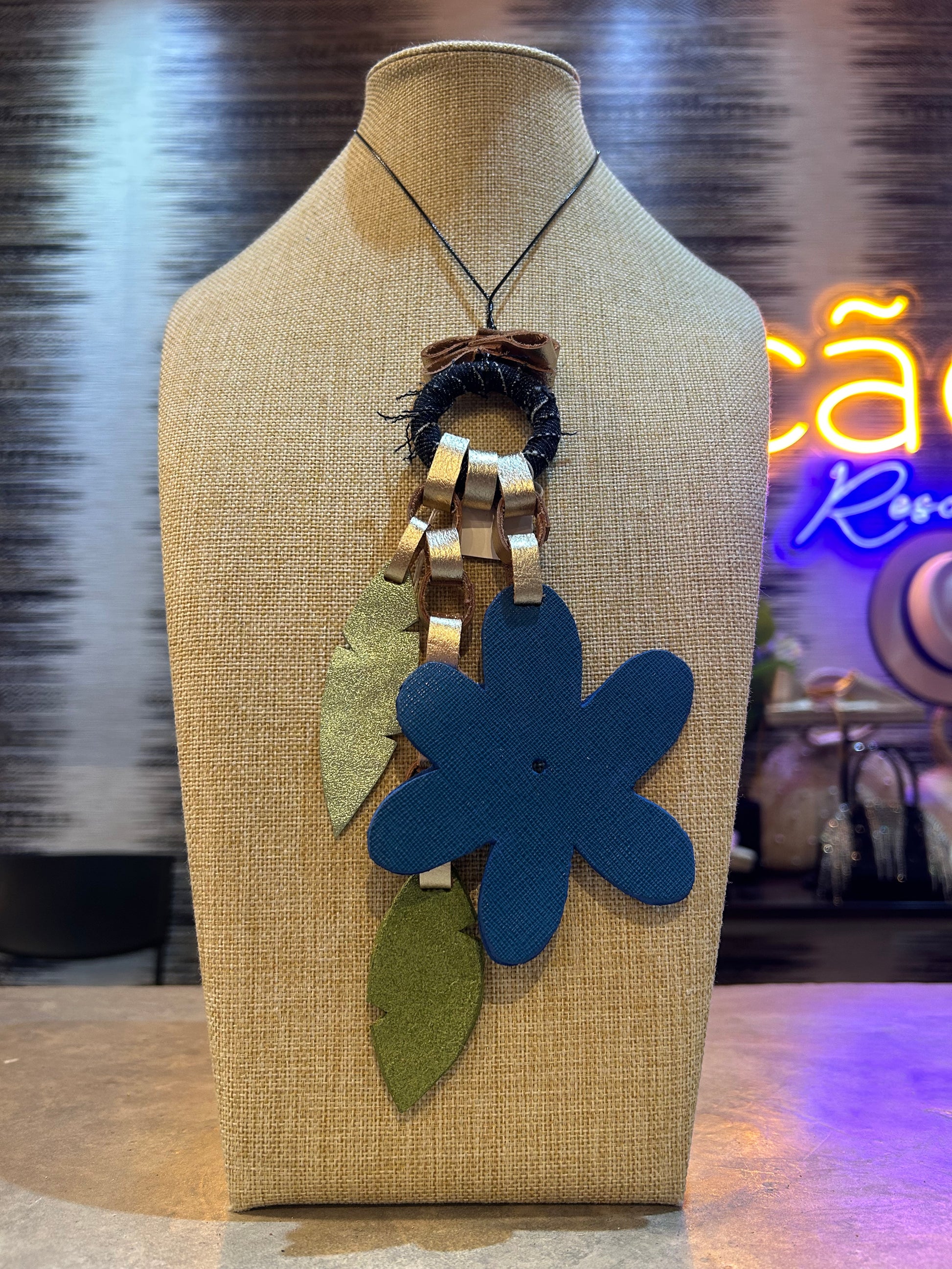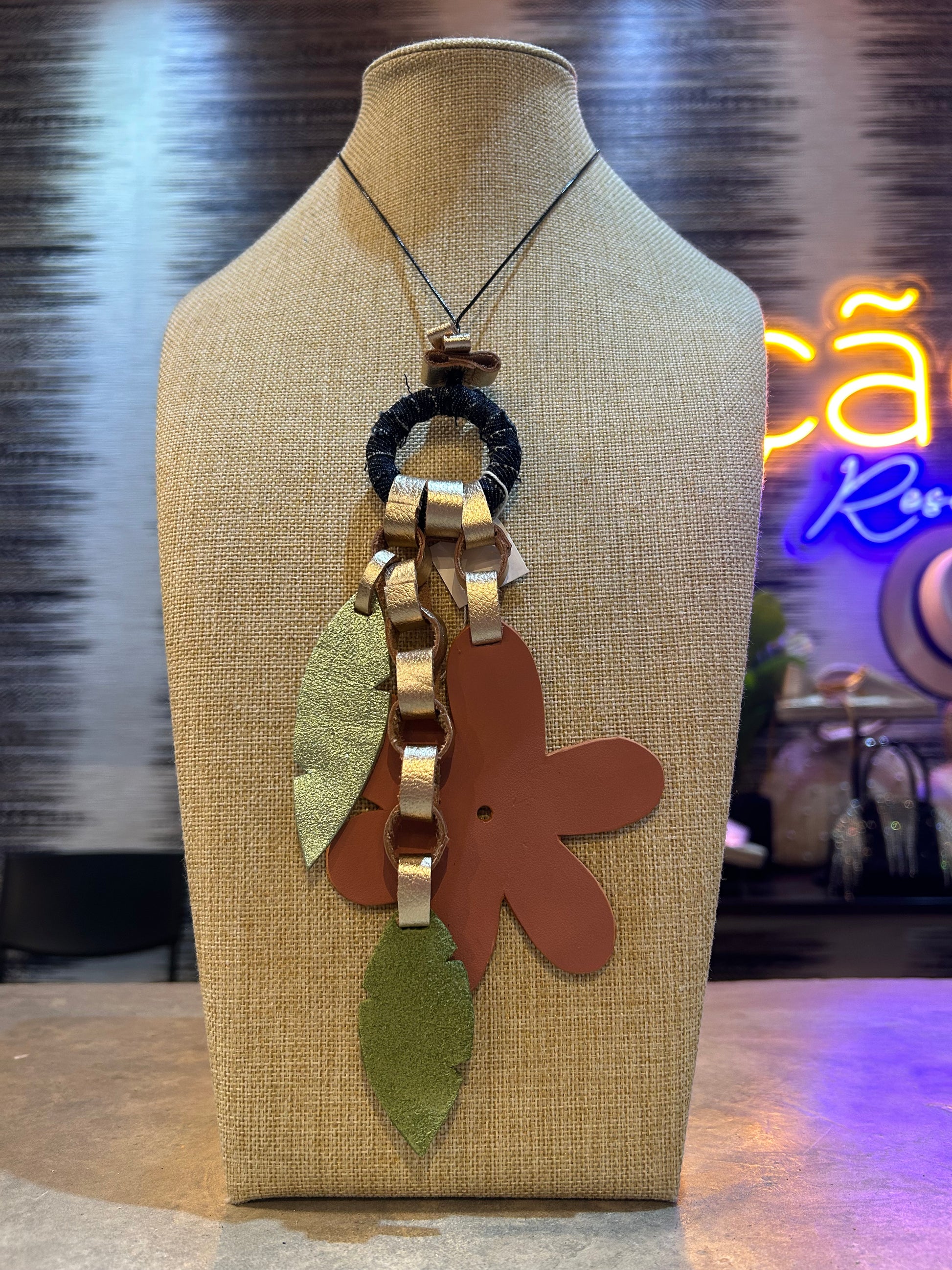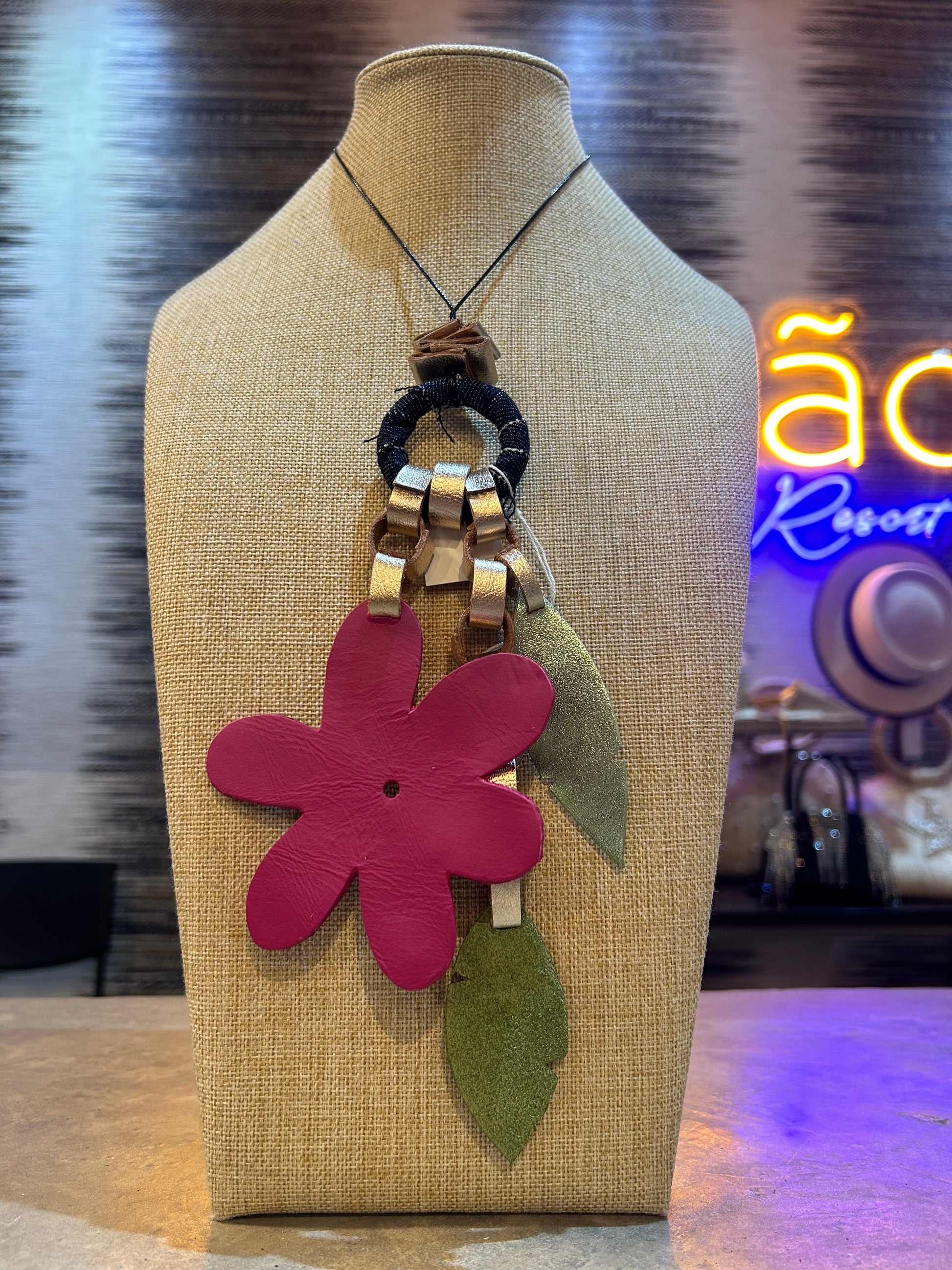 This unique collar is crafted by hand using recycled leather by designer Arlenne Diaz. Support sustainable fashion while making a statement with this one-of-a-kind flower necklace.