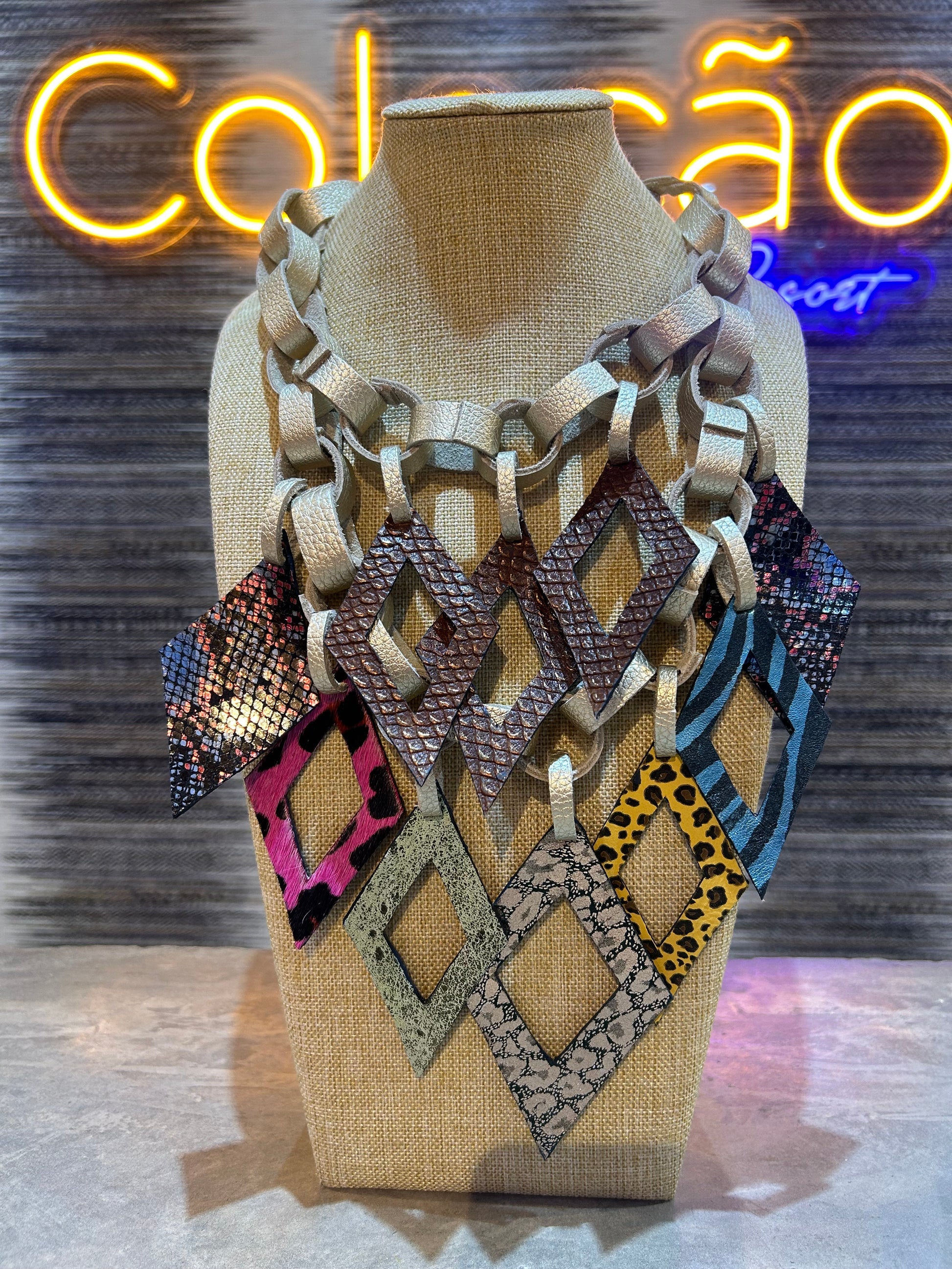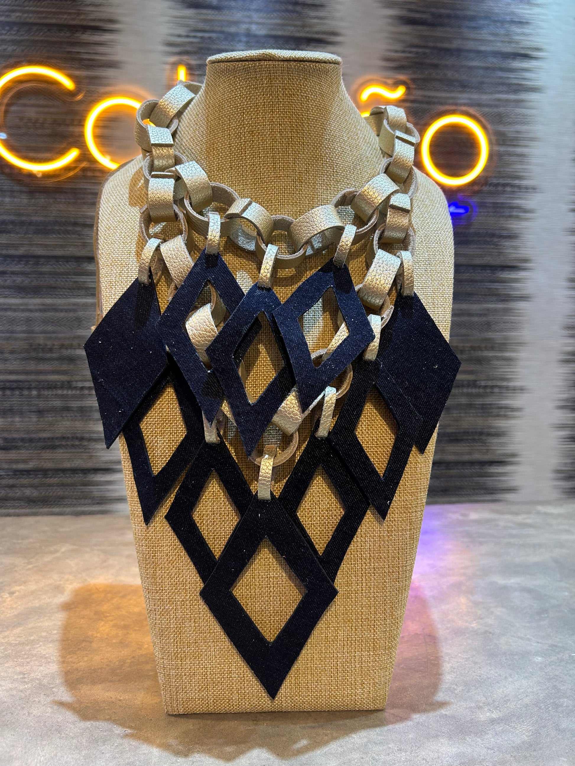 This elegant necklace is hand-crafted by Puerto Rican designer Arlenne Diaz using recycled leather, cut and painted by hand. With its unique diamond shape and environmentally friendly materials, this necklace is both fashionable and sustainable. Upgrade your wardrobe with this one-of-a-kind accessory.