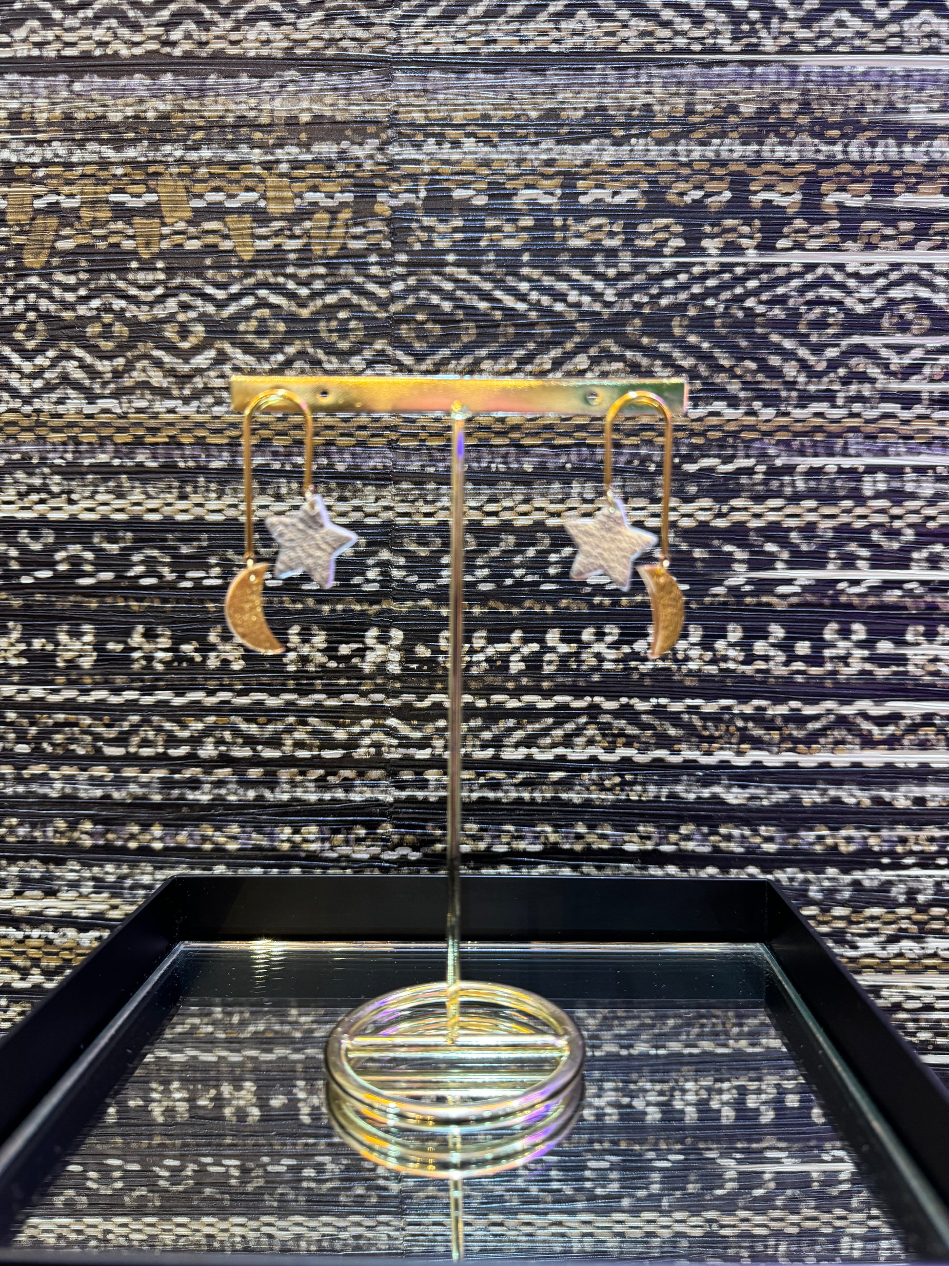 "Add some handmade charm to your look with these Leather and Metal Earrings. With a unique combination of materials, these earrings will make a statement while adding a touch of rustic elegance to any outfit."
