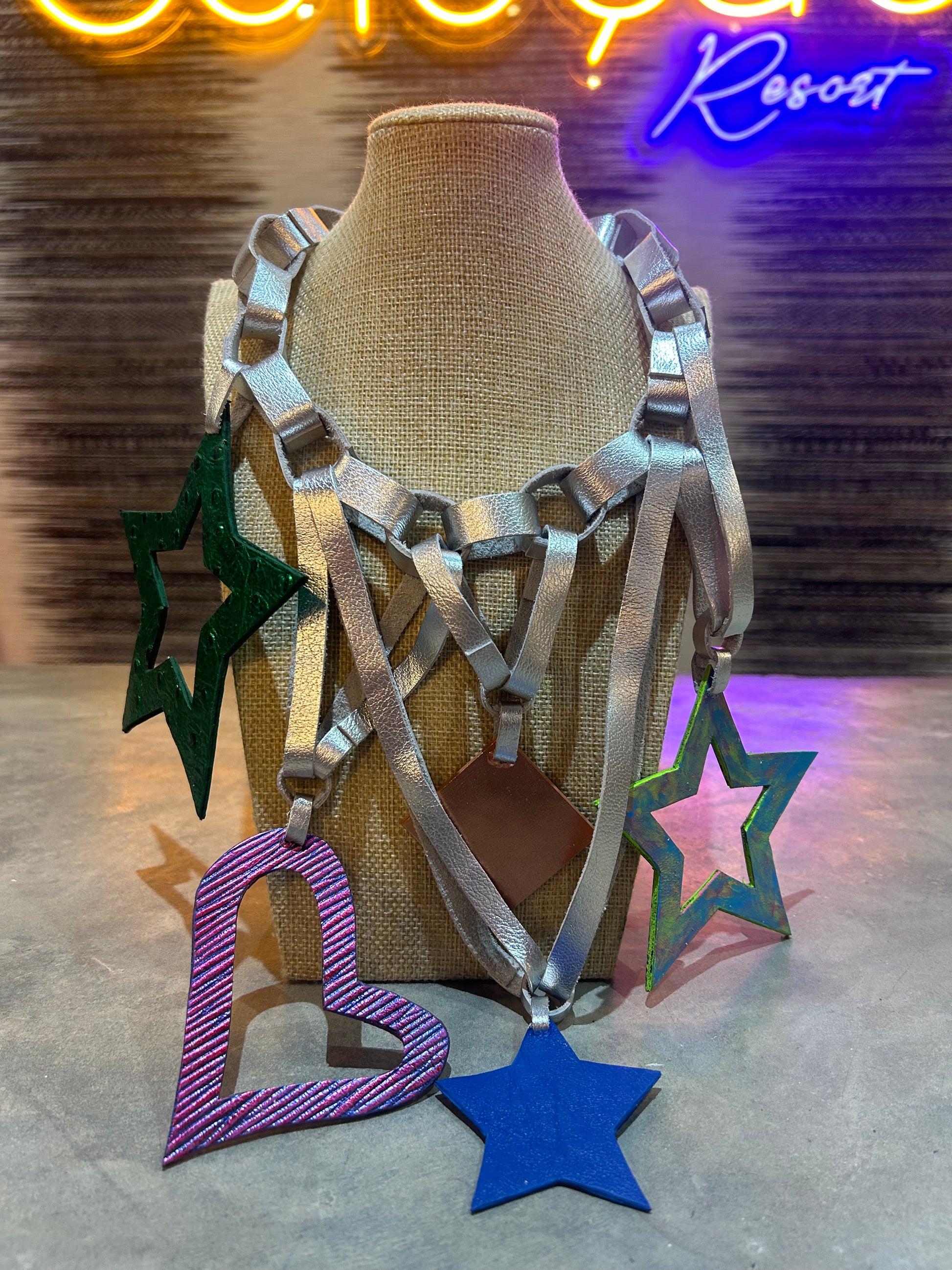 Silver Leather Necklace with Hearts and Stars